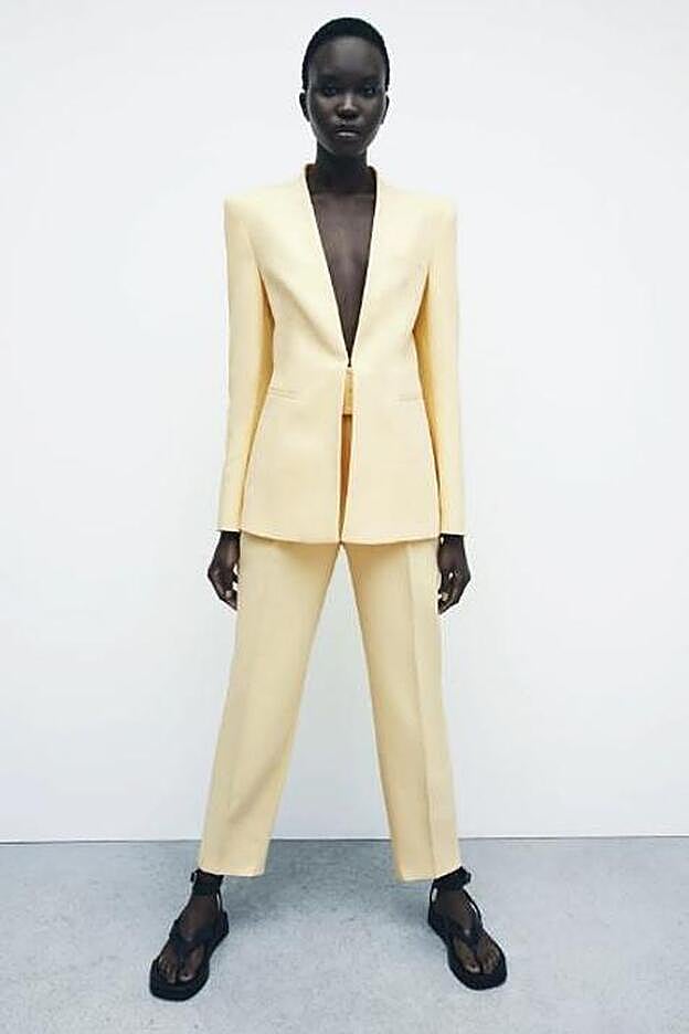 Si por el contrario, prefieres algo más original y llamativo, la opción en amarillo es la tuya. Es un traje en un amarillo pastel súper favorecedor que está formado por un diseño de blazer diferente (39,95 euros), ya que es largo y sin solapas, y un pantalón de pinzas de talle alto con cinturón a juego incluido (29,95 euros). También está disponible en azul pastel.