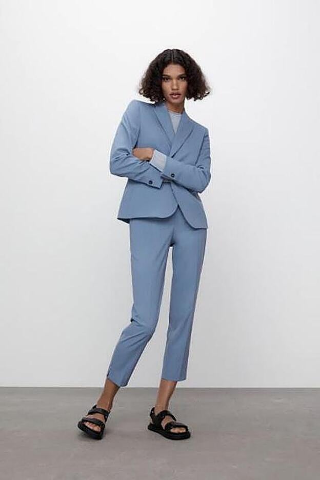 El primero de ellos es un modelo en azul apagado, perfecto para las que quieren poner a sus looks algo de color, pero con un diseño no demasiado llamativo y más clásico. Se trata de un conjunto de blazer (29,95 euros) de corte clásico y un pantalón de pinzas (19,95 euros) a juego con pernera ligeramente estrecha en el tobillo. También está disponible en color rosa.