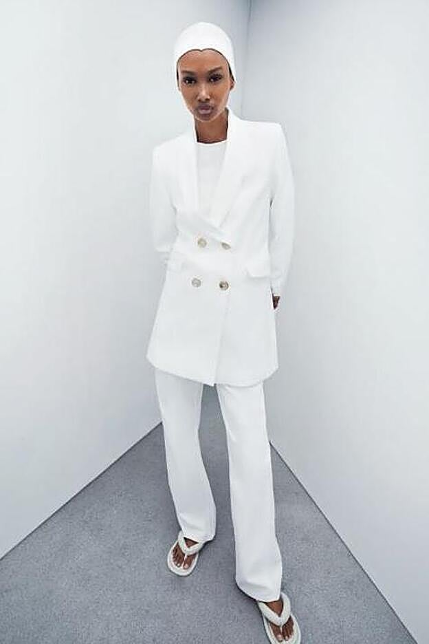 Por último, si quires poner algo de luz, pero lo de los colores llamativos no van contigo, el blanco es el clásico que nunca falla para sustituir al negro. Y este conjunto es perfecto porque su blazer blanca (49,95 euros) es tan larga que se puede usar como vestido. Y el pantalón es un modelo más lagrgo también muy ponibles. ¿Con cuál te quedas?