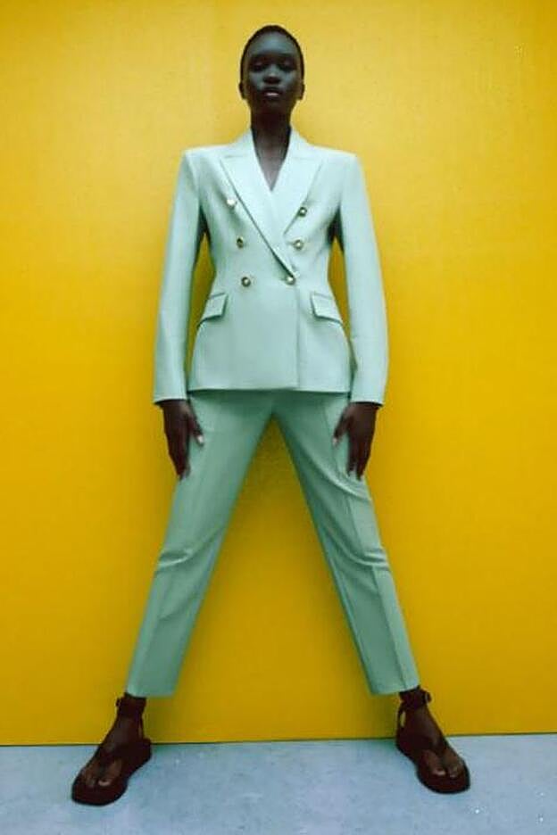 El verde clarito es uno de los colores tendencia de la temporada y añadirlo a tu armario en forma de traje es una opción segura y triunfadora. Este conjunto de blazer cruzada con doble abotonadura (49,95 euros) y pantalón pitillo de pinzas (29,95 euros).