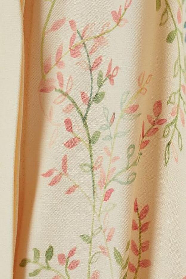 Confeccionado en tejido vaporoso de mezcla de lyocell y lino con pliegues y cintura definida, este vestido en amarillo pastel con estampado floral y de aves en tonos rosas y verdes a lo largo de toda la prenda viene con aberturas laterales y sin forrar.