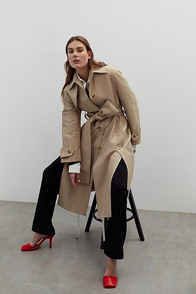 El primer modelo es una gabardina larga de algodón con un cinturón para poder cerrarlo con una gran lazada, botones de cuerno en contraste y aperturas laterales. Además tiene una sobrecapa en un hombro que hace el conjunto asimétrico y le da un toque moderno. Cuesta 79,99 euros y está disponible en talla S y M.