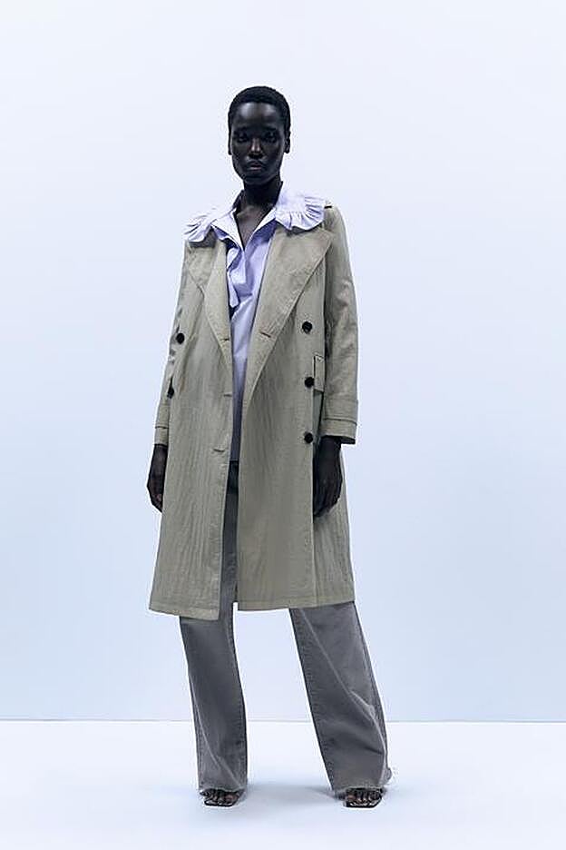 Una alternativa más sport y casual es esta otra gabardina de doble botonadura cruzada, de tejido ligero y con efecto arrugado. Las solapas XL son perfectas para llevar con pantalón de traje y combinarlas con blusas de cuellos con maxisolapas para poder jugar son las superposiciones. Cuesta 35,99 euros y está disponible de las tallas S a la L.