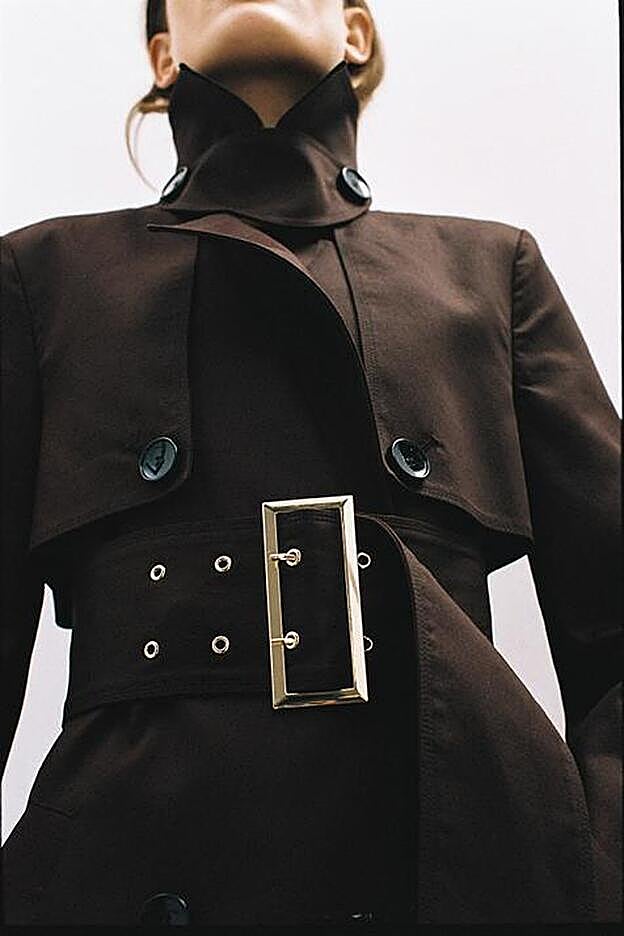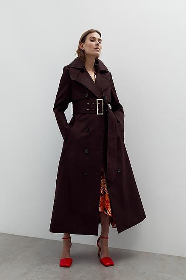 La última gabardina de la colección de primavera de Sfera que es uno de los grandes hallazgos de la temporada para darle a tu armario de entretiempo un giro original y moderno es este diseño en tono marrón chocolate. De largo midi, con doble botonadura cruzada y solapas XL, el detalle que acapara toda la atención es el cinturón, con maxihebilla rectangular y herrajes metálicos en tono dorado.