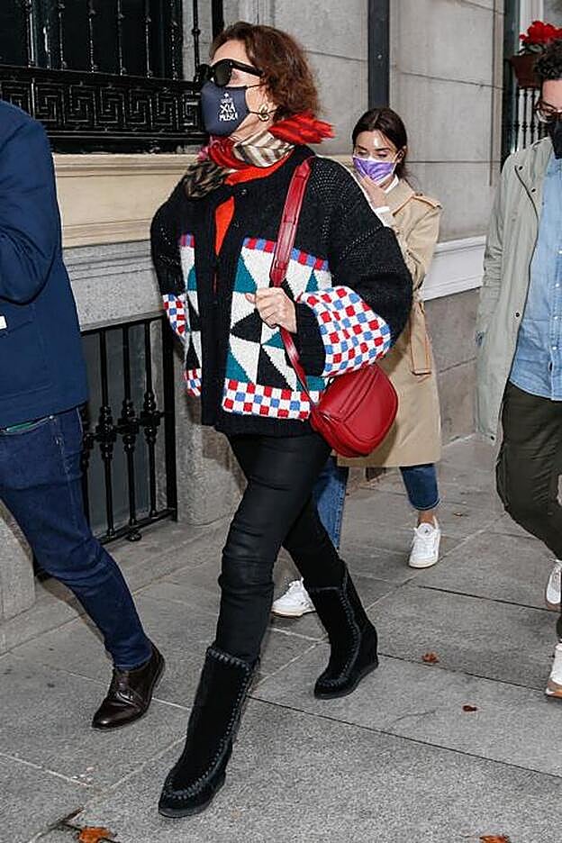 Naty, por su parte, prefirió un outfit más abrigado protagonizado por una chaqueta negra estampada en la parte inferior con formas geométricas en tonos blancos, verdes, rojos y azules. Una prenda muy original que acompañó de un jersey rojo y de unos pantalones pitillo en color negro. Una botas a juego y un bolso rojo completaban este estilismo que sí, nos ha encantado.