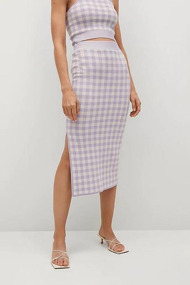 Seguimos con una falda lápiz de largo midi, apertura lateral y tejido de punto fino y elástico para llevarla también en verano. Una falda que estiliza cualquier tipo de figura y que resulta de lo más cómoda. Además, lleva el estampado que está triunfando esta temporada: cuadros junto a un morado pastel que nos ha conquistado. (29,99 euros).
