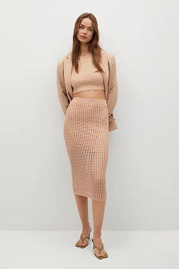 ¿Recuerdas el crochet? Si te declaras fan de este tipo de tejido debes saber que va a volver esta primavera/verano con mucha fuerza y en la firma barcelonesa ya están calentando motores con esta falda midi ajustada de tiro alto, cintura elástica y forro interior en un color arena super favorecedor que te gustará el doble cuando consigas ese tono bronceado con el que ya sueñas. Cuesta 25,99 euros y está disponible en todas las tallas de la XS a la XL.