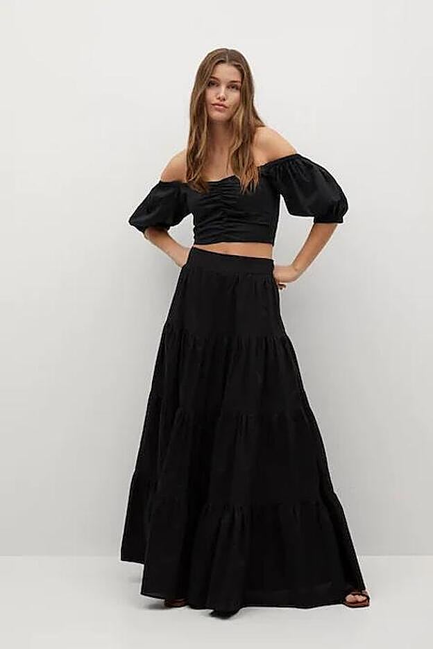 Terminamos con otro de los best seller que arrasa con la llegada del buen tiempo: la falda midi con tejido popelín de algodón y diseño acampanado con acabado de volantes. Ideal para conseguir looks con mucho estilazo en la oficina ¡o en la playa! Está disponible en color beige y también en el clásico negro para acertar sí o sí. ¿Su precio? 49,99 euros.
