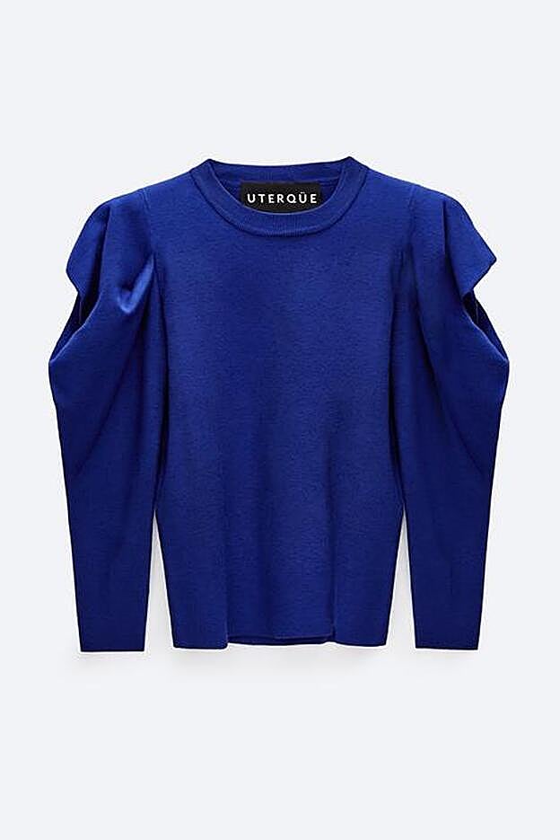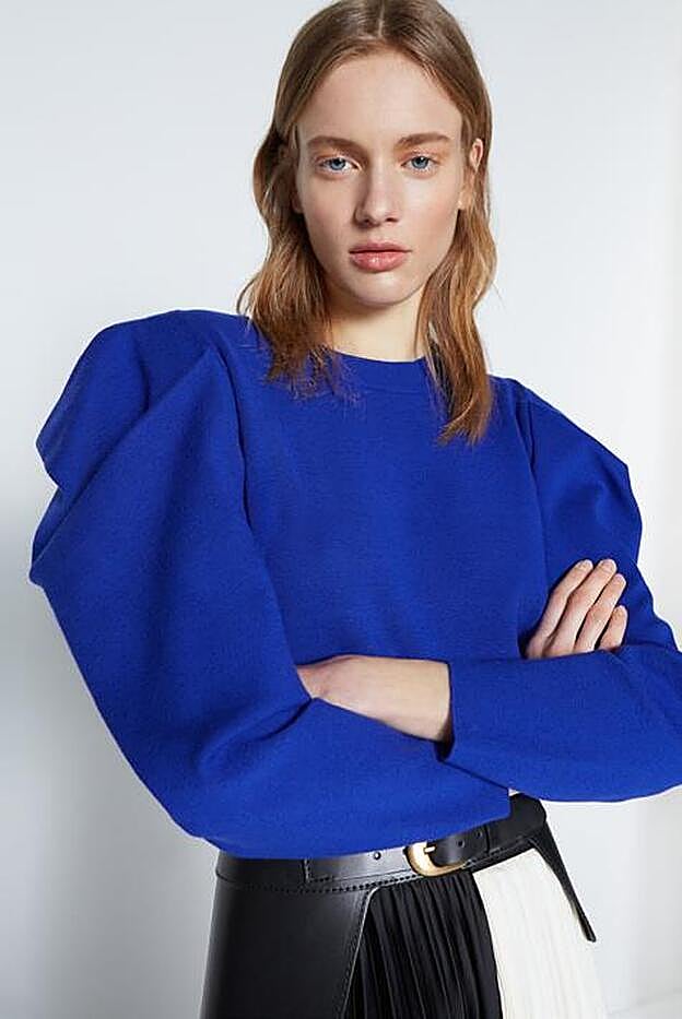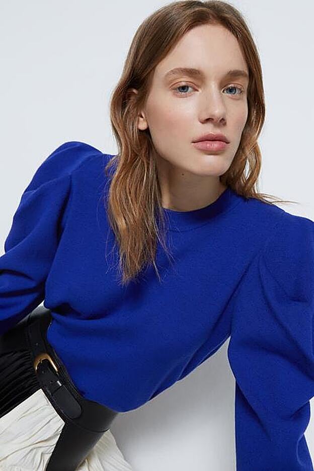 Confeccionado en punto, con cuello redondo y mangas largas, su punto fuerte está en los hombros, que vienen con hombreras y volumen para abullonar la manga.