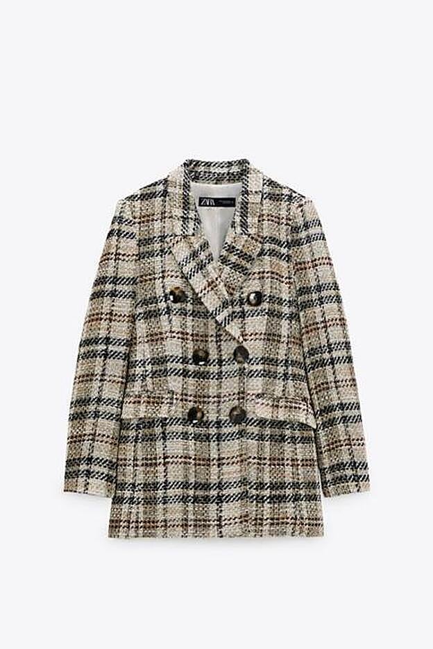 Se trata de una blazer estructurada de estampado de cuadros que tiene un diseño entallado y cruzado con cuello solapa y manga larga y hombros muy marcados. Cuesta 59,95 euros y tiene diferentes tonalidades de beige y negro como protagonistas. Un diseño muy ponible que combina muy bien con todo y que Carolina Darias ha sacado la versión más clásica.