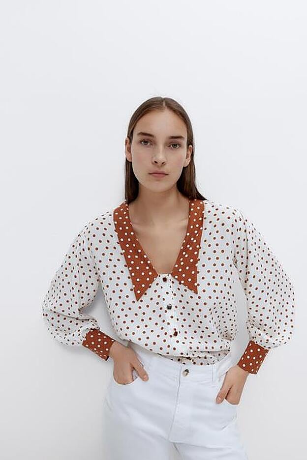 Confeccionada en tejido crepe y con mangas abullonadas, tiene el cierre frontal de botones joya en marrón. Cuesta 69 euros y está disponible en las tallas S, M y L.
