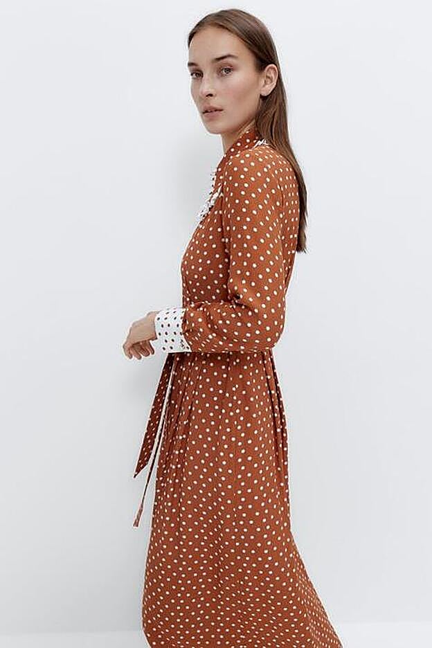 El vestido, de diseño midi confeccionado en un tejido de crepe con estampado de topos viene con cuello bobo con volante a contraste y abertura mediante tapera frontal oculta.