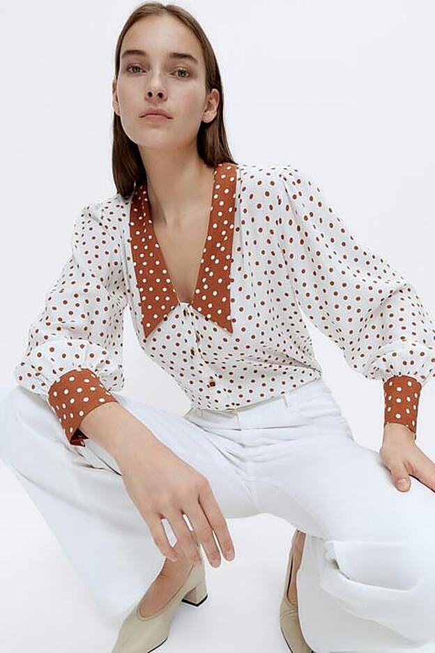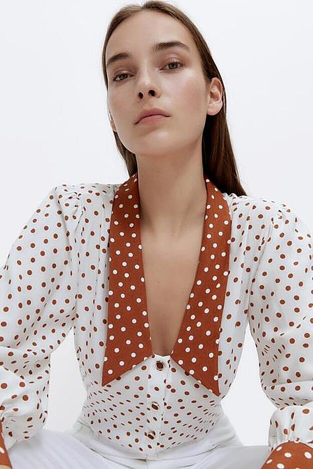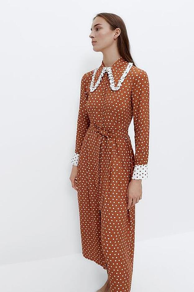 Y además, lejos de crear dos versiones del mismo tejido han decidido darle la vuelta, y mientras que la camisa apuesta por el blanco con lunares en camel, el vestido es de color camel con topos en color blanco. Para que sea aún más difícil escoger con cual de las dos te quedas.
