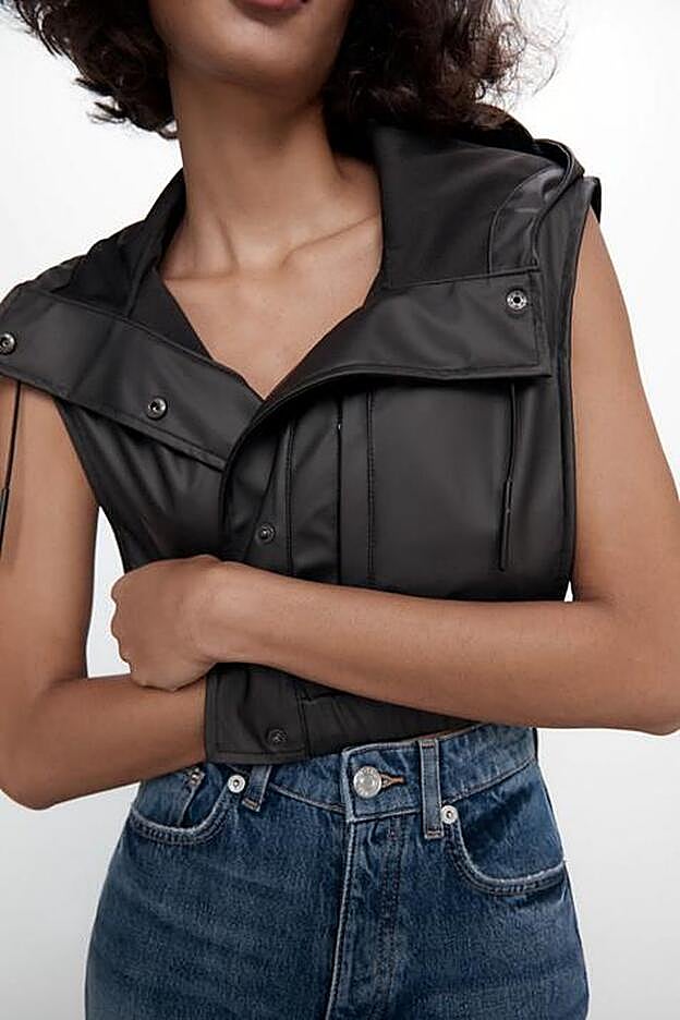 La última propuesta es este chaleco negro engomado y con diseño corto que viene con capucha con visera ajustable con cordones elásticos y stopper.
