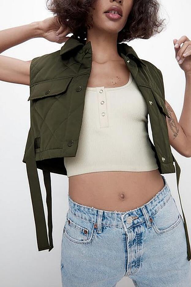 El más exitoso es este chaleco cropped acolchado en color caqui, con cuello de solapa, manga sisa amplia con botones a presión y falsos bolsillos con solapa en delantero.