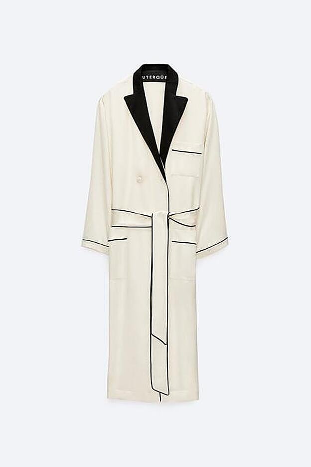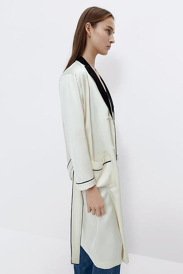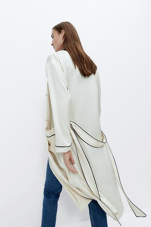 Confeccionado en un tejido satinado con solapas a contraste, viene con cinturón a tono en el tejido con vivos en negro, al igual que en los puños y los bolsillos laterales de plastrón.