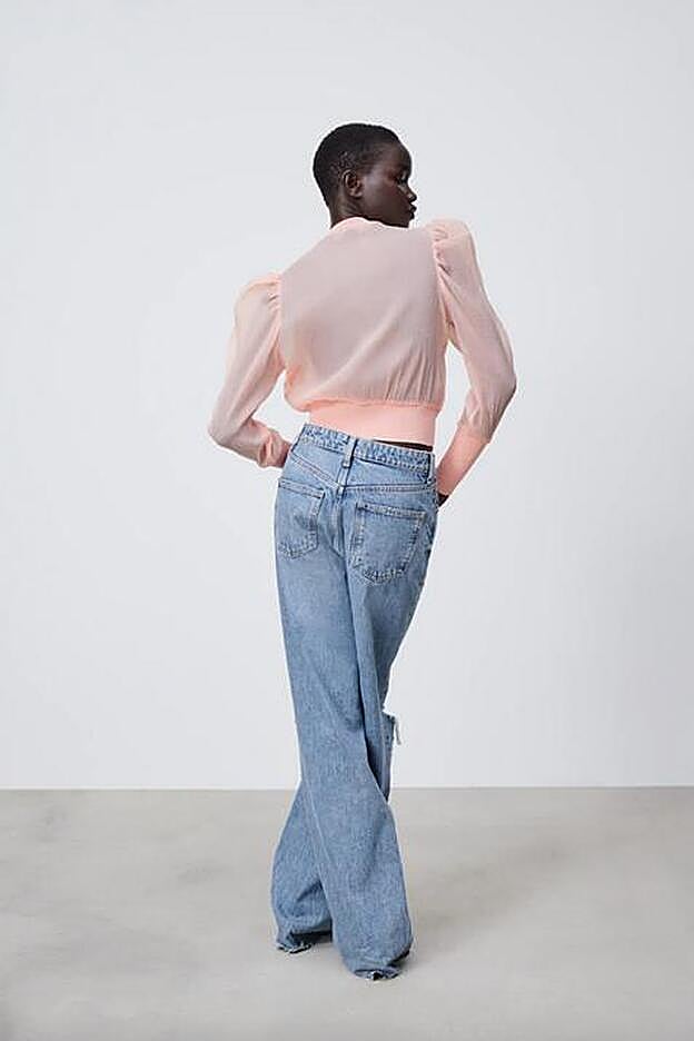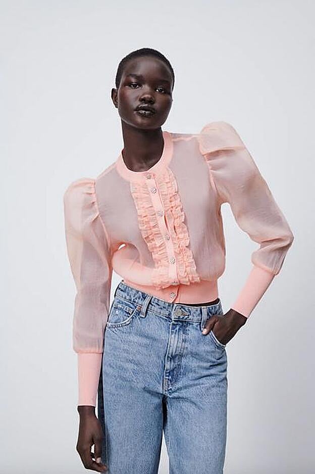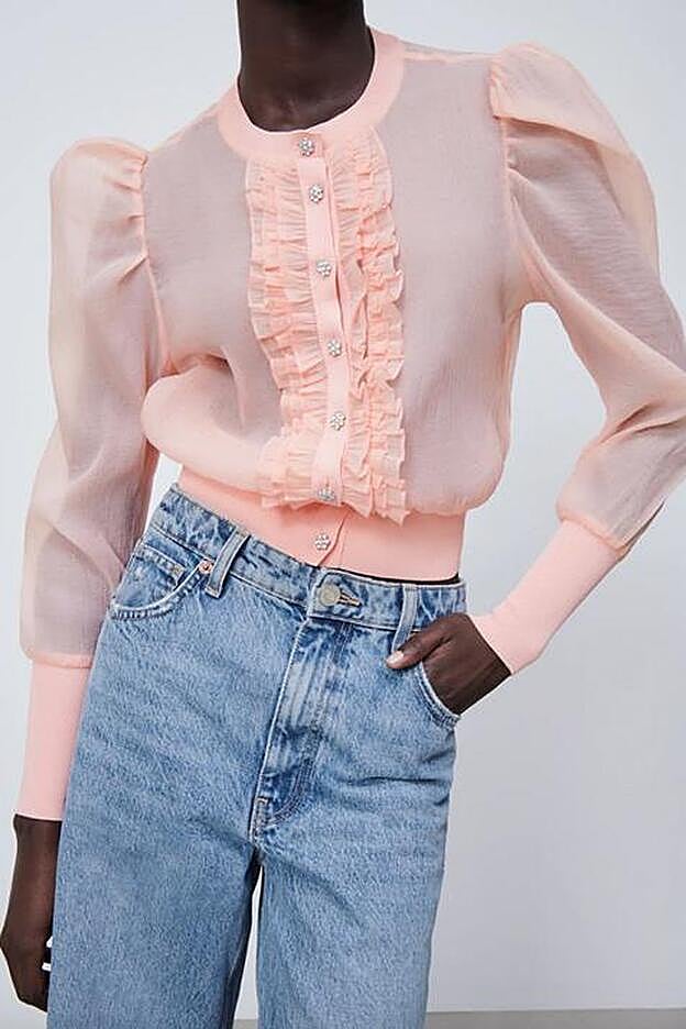 Y es que el cierre frontal es de botones joya y a los laterales están acompañados de tres preciosas filas de volantes. Con cuello redondo y mangas abullonadas en los hombros, el cuerpo de la prenda es de organza.