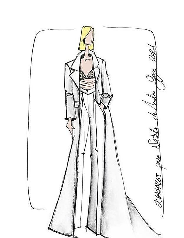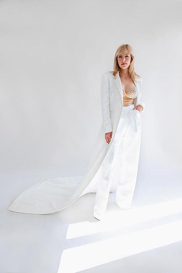La americana, según nos explican desde la firma "se alarga dando paso a una gran cola" creando un efecto de película, nunca mejor dicho, mientras que el pantalón ancho de doble piza acabado con una cinturilla con un ligero pico delantero pone la guinda del pastel, sin olvidar el bralette joya, que se ha confeccionado artesanalmente para la ocasión y está bordado con estrellas y abalorios semitransparentes.