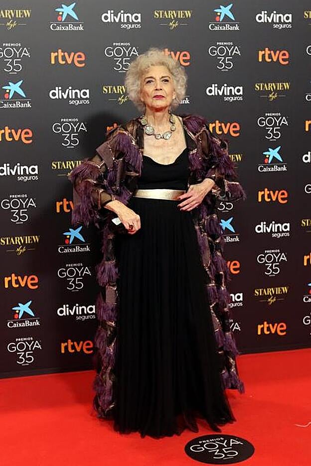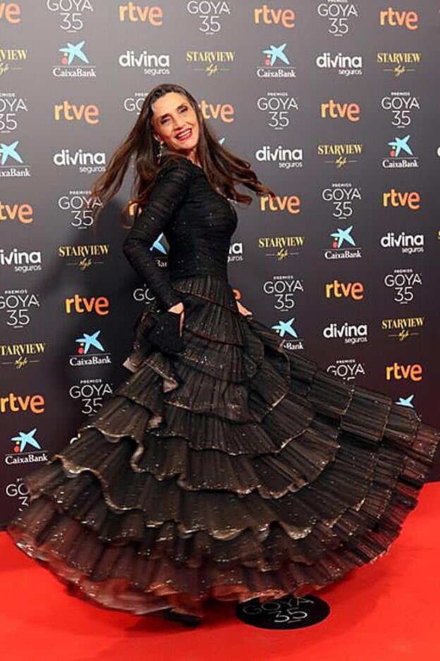 Ángela Molina posaba así de contenta en la alfombra roja de los Premios Goya 2021. Esta noche recibía el Goya de honor por toda su carrera con este vestido de Giorgio Armani.