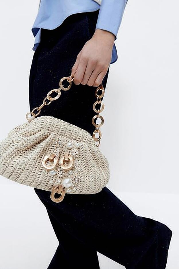 Esta propuesta trenzada en crudo también nos ha conquistado gracias a los cristales de su parte delantera, su asa de mano de cadena carey combinada y su cierre de boquilla trenzado. También viene con asa bandolera extraíble y cuesta 99 euros.