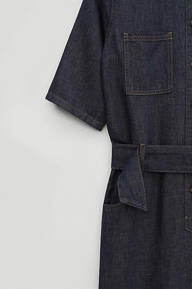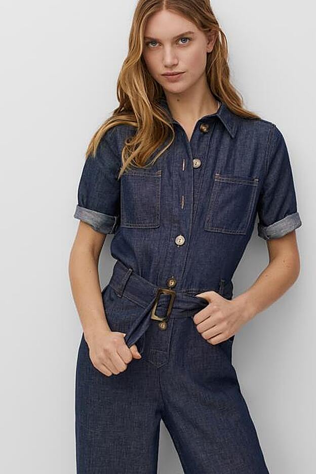 Otra de las propuestas de Massimo Dutti es este mono vaquero en azul oscuro confeccionado en tejido de algodón y lino. Con cuello clásico, tiene bolsillos de plastrón en la pechera y dos bolsillos laterales en el pantalón.