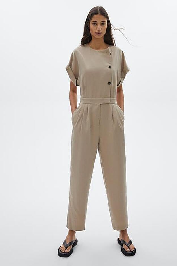 Entre las propuestas más idóneas para conseguirlo está este mono de Massimo Dutti en color camel, con cuello redondo y cierre mediante botones a contraste en el frontal. Las mangas cortas vienen con vuelta y en la cintura tiene pinzas, para ajustarlo a nuestra figura y entallarla.