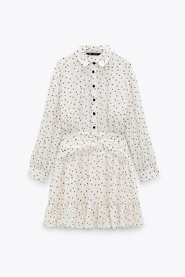 Nagore escogió para su última participación en el debate de 'La isla de las tentaciones 3' un look que ha tenido mucho éxito y que, para variar, ha gustado muchísimo a sus seguidores. Se trata de un estilismo protagonizado por un vestido en color crudo con pequeños lunares negros que está formado por dos partes. El cuerpo de estilo camisero con cierre de botones y manga larga y una falda mini con frunces en la cintura y un volante en el bajo que le da movimiento.