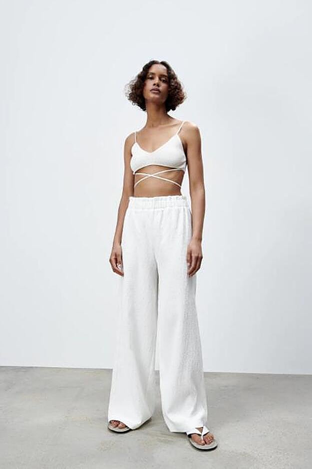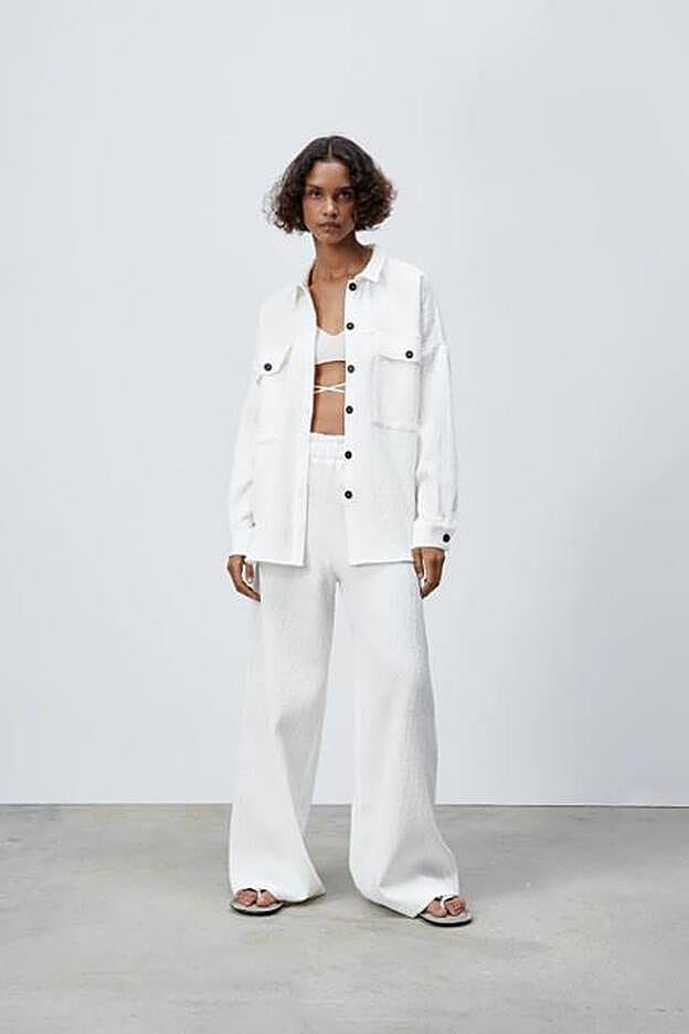 El pantalón ancho, del mismo blanco roto que la sobrecamisa, es de tiro alto y cintura elástica, y no puede ser más cómodo y fresquito para la primavera que está a punto de llegar. Puedes encontrarlo en la web de Zara por 29,95 euros.