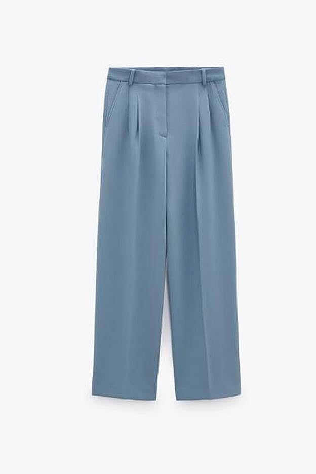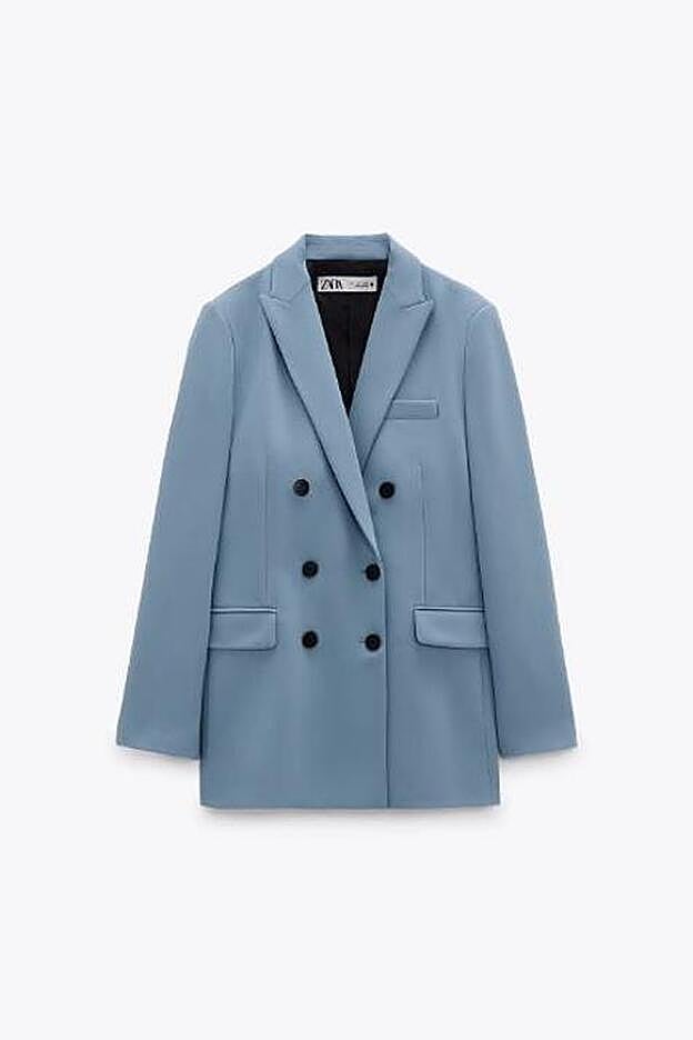 Se trata de un traje de chaqueta y pantalón de Zara que tiene uno de los colores más bonitos que hemos visto hasta ahora. Un azul apagado muy diferente al azul bebé al que estamos acostumbradas y que nos parece ideal para primavera. La parte superior es una blazer estructurada, con un diseño cruzado, manga larga y doble abotonadura en color negro. Cuesta 59,95, tiene bolsillos delanteros y lleva a juego unos pantalones de pinzas y corte 'wide leg' que cuestan 29,95 euros.