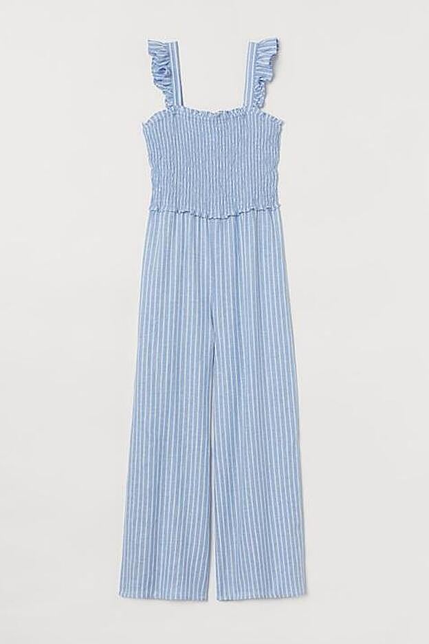Si lo tuyo son las prendas más largas, este mono de H&M es ideal. Tiene una pernera ancha y el cuerpo fruncido con elástico que se ajusta a la perfección. Lleva los tirantes anchos con volante y cuesta 39,99 euros. ¿El truco para poder usarlo en primavera? Añade una camiseta blanca debajo y... ¡Listo!