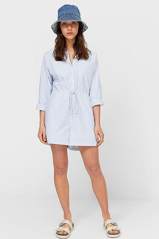 El primero de ellos es un mono corto de Stradivarius de rayas balncas ya azules. Tiene un diseño camisero con manga larga y fruncido en la cintura que nos encanta por su corte holgado y cómodo, pero también por ese diseño ajustado encima de las caderas. Cuesta 25,99 euros y podrás usarlo en verano con sandalias, pero también en primavera con botas y una chaqueta de entretiempo.