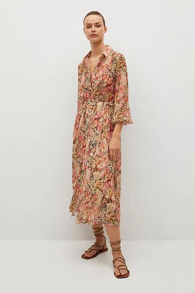 Y el último vestido que te enseñamos es este de Mango con estampado floral y cinturón. De corte midi, cuello de solapa, manga larga y tejido fluido, es un vestido ideal para lucir con sandalias, zapatillas o unas buenas botas cowboy. Su precio es de 49,99 euros.