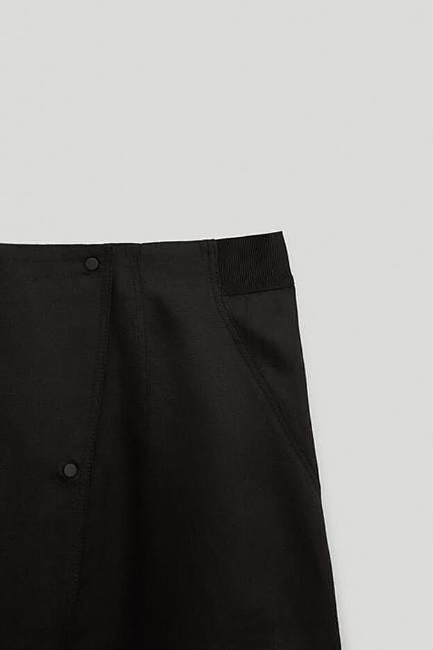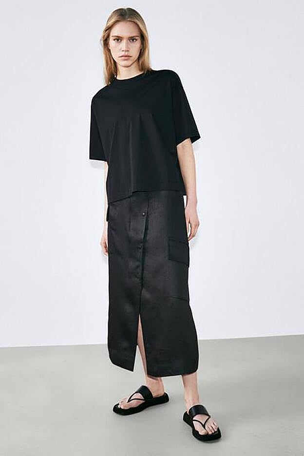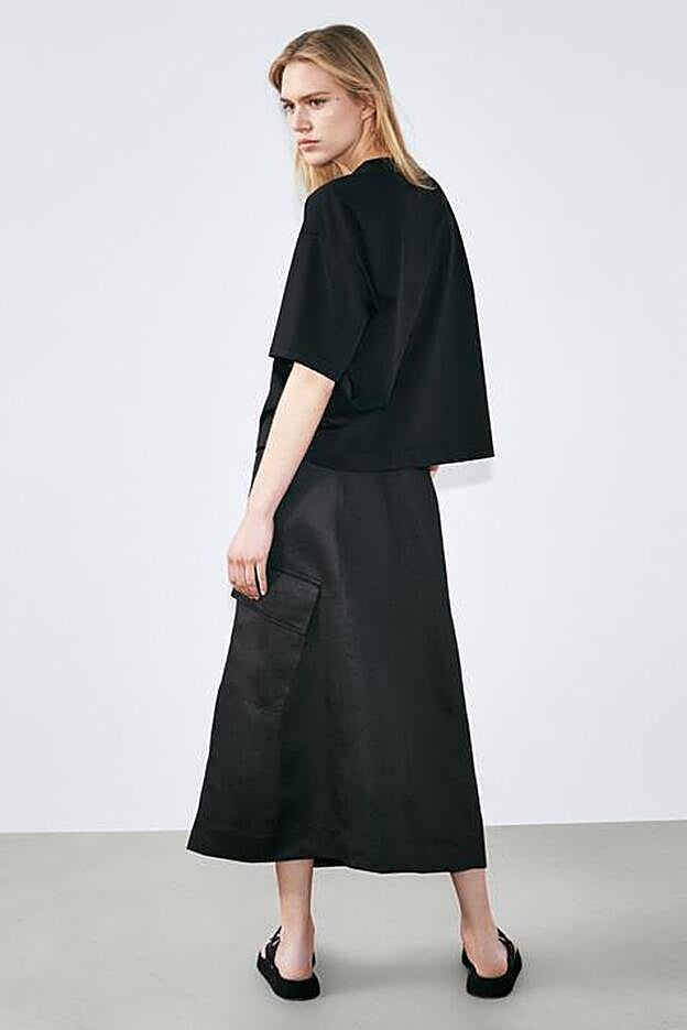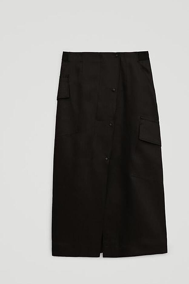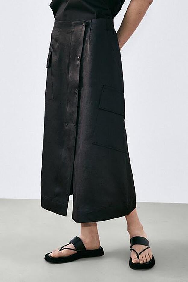 La falda de lino de la colección edición limitada de Massimo Dutti es de diseño cargo, con bolsillos laterales de plastrón con solapa, y de corte evasé.