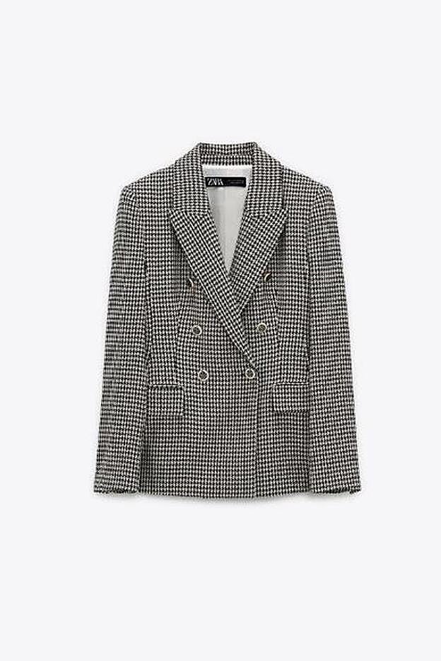 Eva escogió una en color beige que sabemos de dónde, pero hemos encontrado una idéntica en H&M que cumple todos los requisitos yq ue cuesta 29,99 euros. Después, añadió una blazer de estampado pata de gallo que imita unos pequeños cuadros y que puedes encontrar en muchas firmas low cost. De hecho, ahora en Zara hay una casi idéntica que cuesta 49,95 euros.