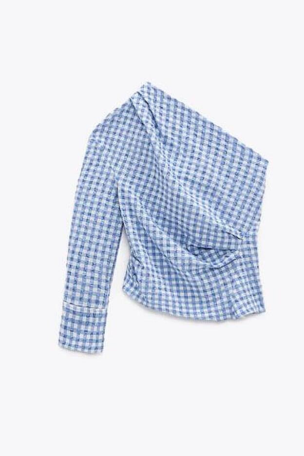 Ya fichamos este top asimétrico cuando nos enamoramos de estos conjuntos de cuadros vichy de Zara. Se trata de un cuerpo con una manga protagonizado por un bonito estampado de cuadros mini en color blaco y azul que cuesta 29,95 euros. Tiene una falda midi a juego y ya está agotado en una de sus tallas por lo bonito que es. Añade unos pantalones blancos como ha hecho la influencer Allis Guijarro y... ¡Lista para triunfar!