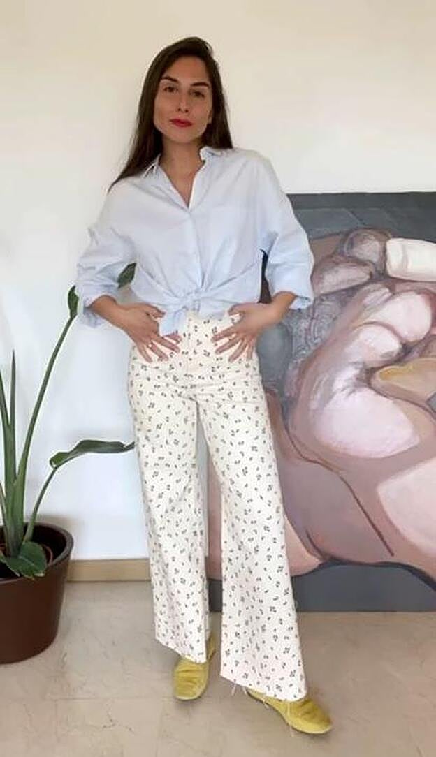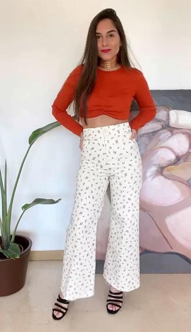 Aprovecha el tiro súper alto de estos pantalones y haz como Erea Louro y añade una camiseta o jersey cropped en un color teja, naranja o marrón que contraste con el sutil estampado del pantalón, pero que siga la misma sintonía de color. Unas sandalias negras y obtendrás un look de entretiempo perfecto.