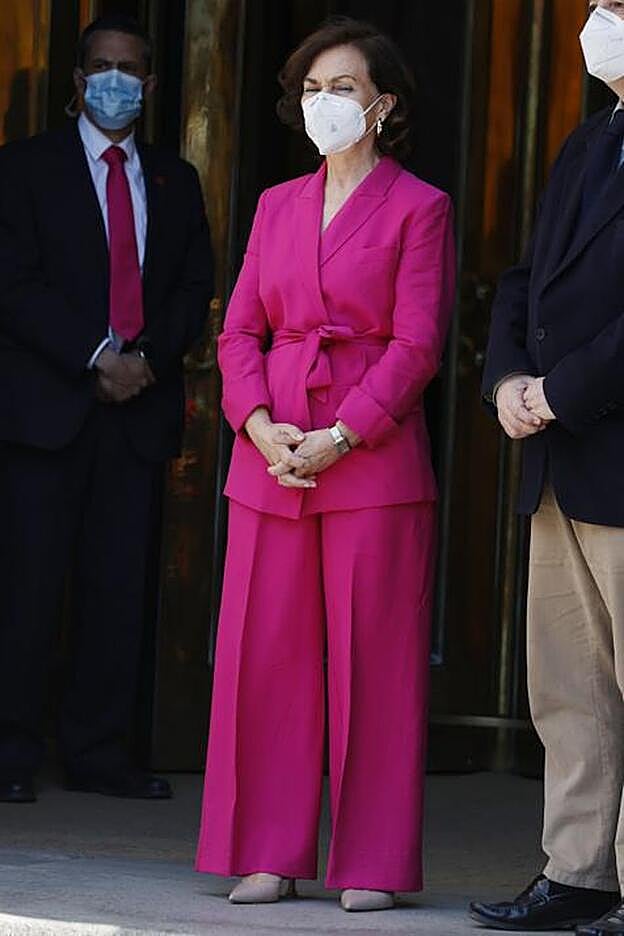 Sfera ha actualizado su colección de primavera añadiendo nuevas prendas de las que este traje que ha llevado Carmen Calvo es el absoluto protagonista. Se trata de un conjunto de chaqueta y pantalón caracterizado por un color rosa fucsia, el tono tendencia del momento y al que tienes que unirte sí o sí.
