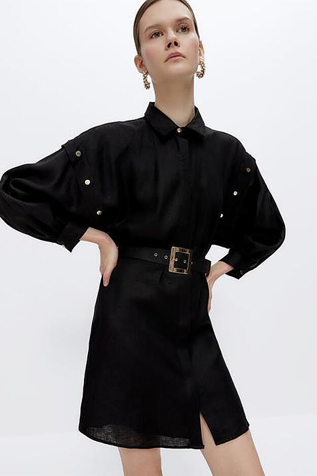 Otra de las propuestas más vistosas de la colección es este vestido corto confeccionado en un tejido de alta calidad. Con cuello clásico, mangas desmontables mediante snaps dorados y cierre frontal de botones ocultos por la tapeta, viene con cinturón a juego con hebilla dorada y podemos encontrarlo en las tallas S y M por 119 euros.