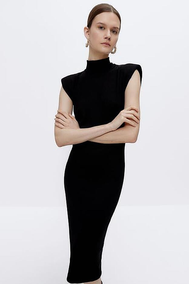A la tercera propuesta de Uterqüe no le faltan tendencias, porque este vestido de punto negro viene con hombreras y un fit ajustado para proporcionarnos un look muy favorecedor. Con cuello perkins y cierre de cremallera en la espalda, cuesta 99 euros y podemos encontrarlo en las tallas S, M y L.