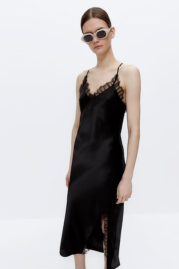 Por último, Uterqüe apuesta por este vestido lencero confeccionado en seda y en color negro para completar la colección. Tiene tirantes ajustables finos, abertura lateral en el bajo y transparencias en el escote y el bajo. Cuesta 129 euros y está disponible entre las tallas XS y L.