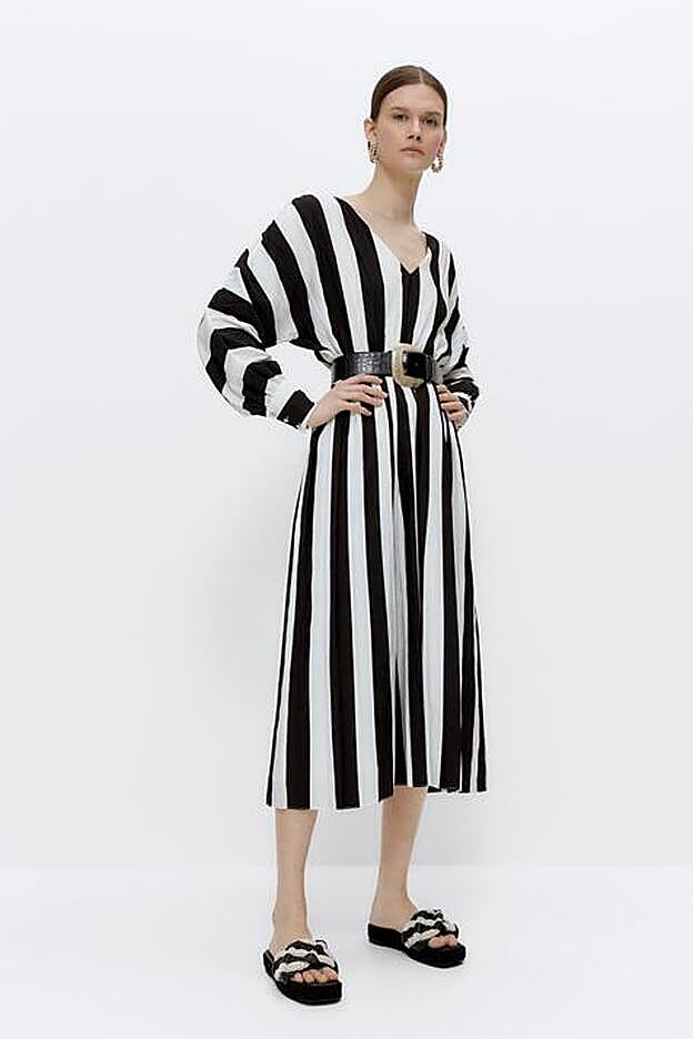 Todos son preciosos pero el que nos ha conquistado, por su original propuesta de colores es este vestido midi confeccionado en un tejido plisado con estampado de rayas en blanco y negro. Con escote de pico frontal y en la espalda, viene con cinturón a juego con hebilla dorada y tiene un precio de 119 euros. Está disponible entre las tallas XS y L.