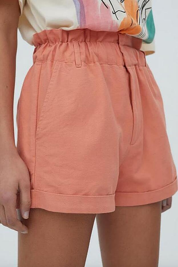 Una de las propuestas más apropiadas para la temporada primavera-verano es esta bermuda con cintura paperbag en color naranja pastel, con cintura elástica y bolsillos laterales.