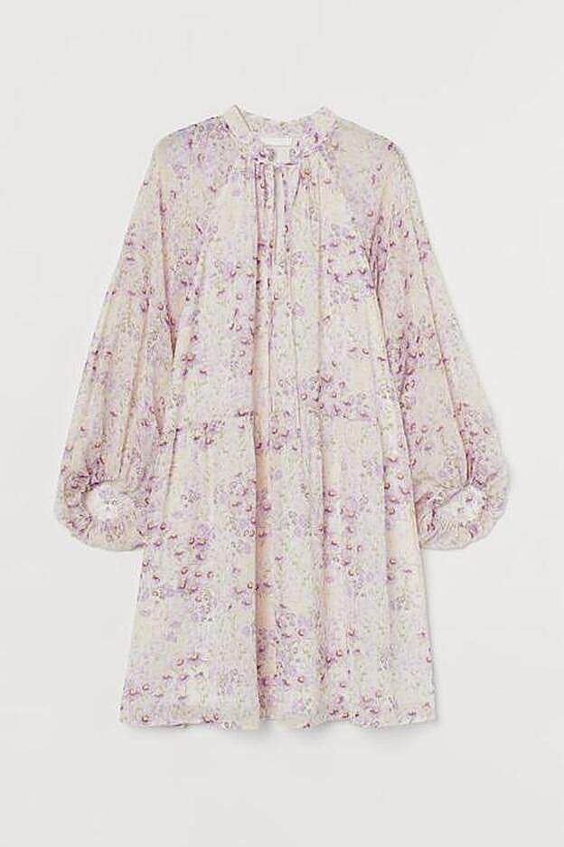 Se trata de un vestido evasé corto en tejido vaporoso con cuello elevado corto y abertura con tiras de anudar finas en el escote. Lleva unas originales mangas tres cuartos globo de corte raglán con elástico en los puños, costura fruncida en la cintura y falda con vuelo. Además, está confeccionado con poliéster parcialmente reciclado. Cuesta 29,99 euros y está disponible también color negro.