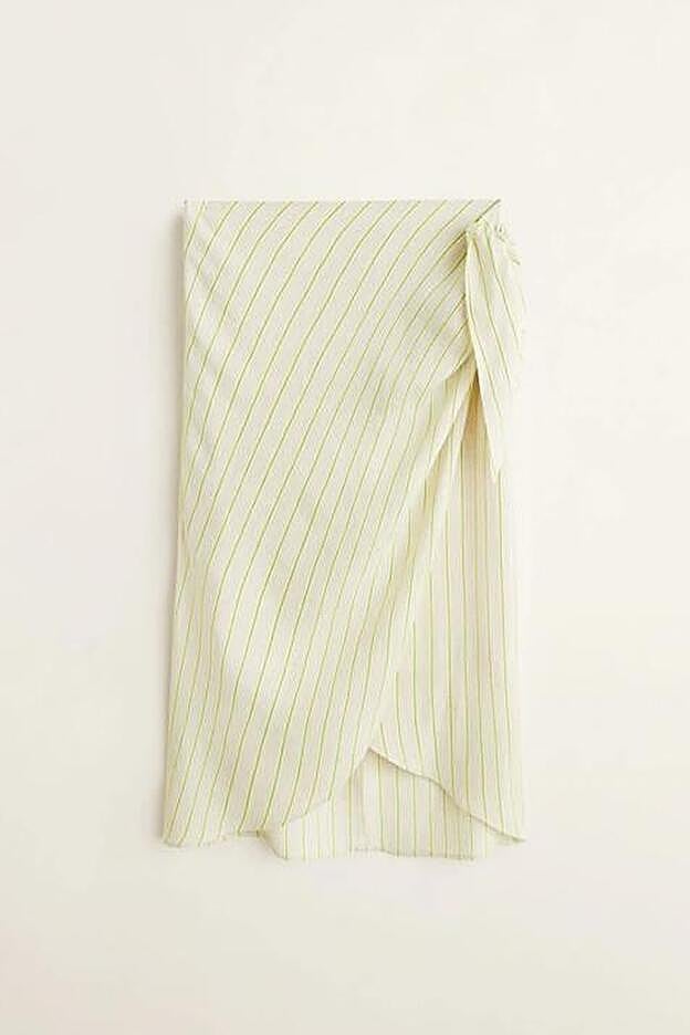 Se trata de una falda super fresquita con tejido de lino beige y fluido, estampado de rayas en color verde pastel y un cierre de lazo que le da el toque de originalidad que necesita y ese efecto estilizador que tanto nos gusta.