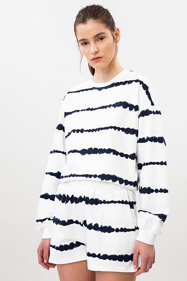 Se la hemos visto a Dulceida y nos ha enamorado. Es una sudadera de chandal corta y blanca con estampado de rayas y tie dye en negro y puedes encontrarla tanto en ese estampado como en otro más colorido por 12,99 euros.