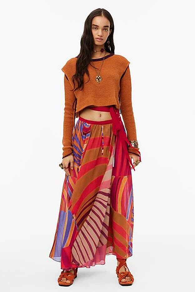 Se trata de una falda estampada de tejido fluido de la colección Limited Edition de Zara. Su tiro algo y el detalle de lazada en la cintura, consiguen un efecto estilizador muy favorecedor y su estampado en varios colores te quita 10 años de encima. Cuesta 69,95 euros y la talla L ya está agotada.