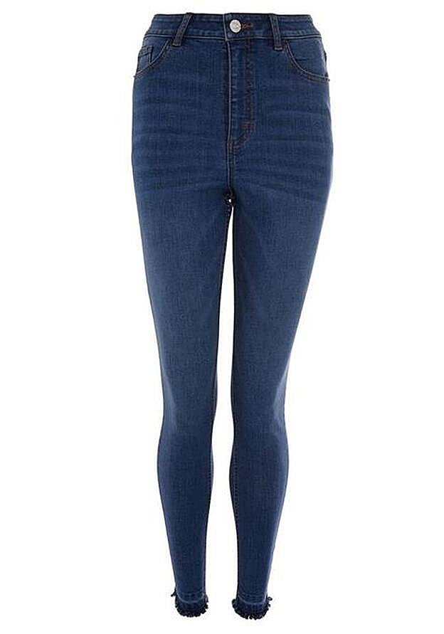 Para las que se resisten a los modelos anchos y siguen prefiriendo el pitillo, Primark tiene un modelo que cumple con las características para que un vaquero estrecho quede bien. Talle muy alto, diseño elástico y detalle en el bajo. Estos cuestan 17 euros y demuestran que los pitillo se siguen llevando.