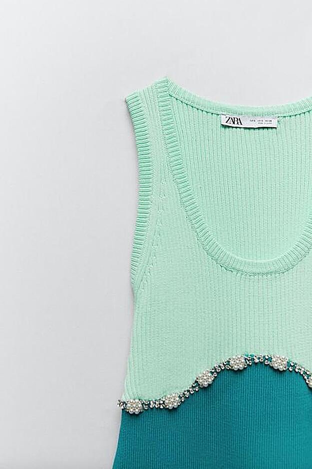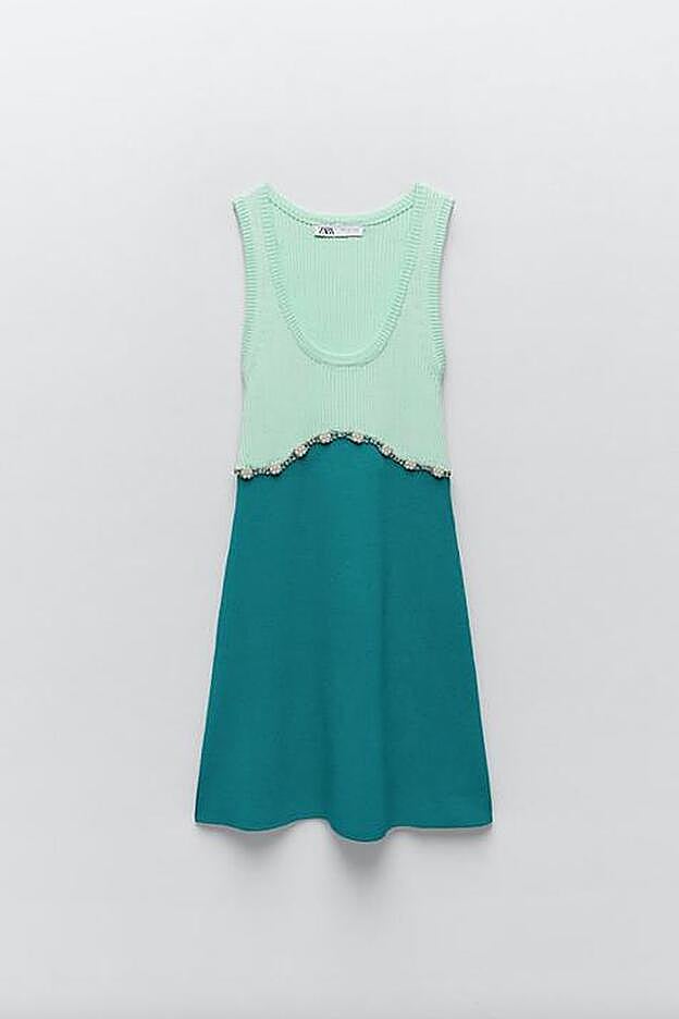 En dos tonos combinados tan primaverales como elegantes y con detalle de aplicación joya, el nuevo vestido mini de Zara es ideal para las tardes de primavera y verano, pero también para acompañarlo de unos accesorios impecables y convertirlo en nuestro nuevo vestido de invitada, ideal para cualquier compromiso que se ponga por delante.