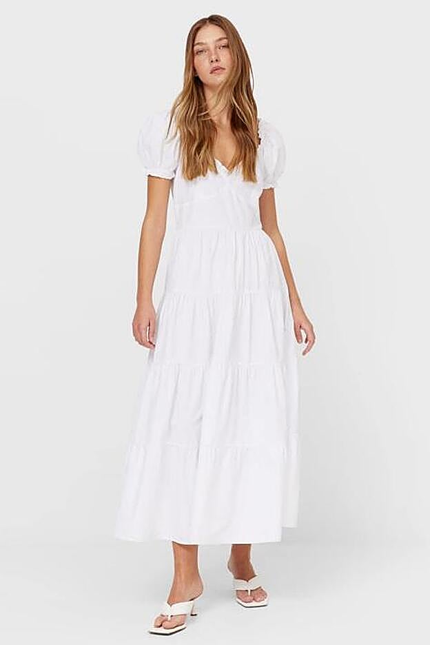 El primero de ellos es el blanco, que se caracteriza por tener un bonito escote corazón y por tener la manga corta abullonada acabada en volante. Cuesta 25,99 euros, está disponible desde la talla XS a la XL y tiene la falda compuesta por grandes volantes anchos.