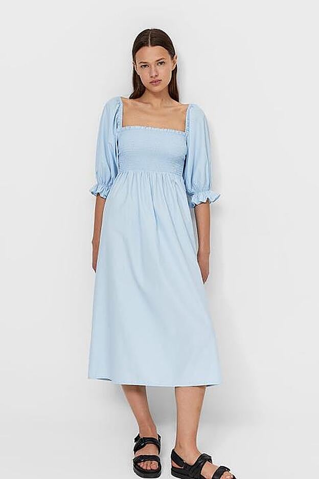 El azul, por su parte, es un vestido de corte recto y largo midi, que lleva el cuerpo fruncido con nido de abeja y escote recto. Cuesta 29,99 euros y lleva unas mangas más largas que las del blanco, también ligeramente abullonadas y con el bajo acabado en volante. Un modelo disponible también desde la tall XS a la XL que tiene todas las papeletas para agotarse en un abrir y cerrar de ojos.